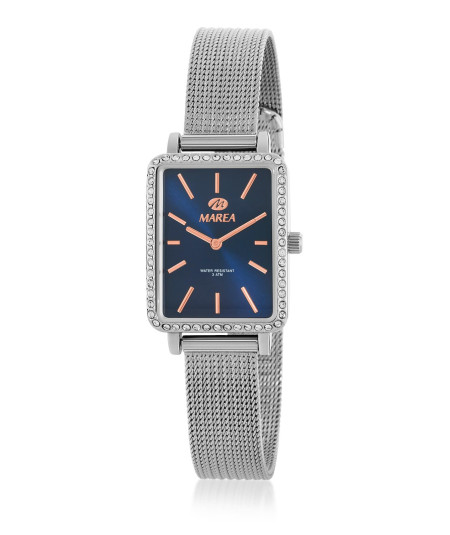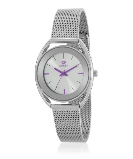 Reloj para mujer, analógico con caja de metal antialérgico color plata y esfera color plateado con índices y agujas en color morado. Correa de...