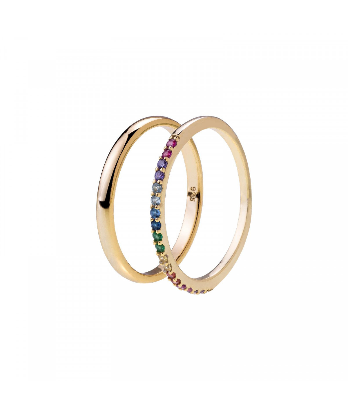 Unos anillos de plata de ley bañados en oro, uno de ellos liso y el otro con circonitas multicolor.