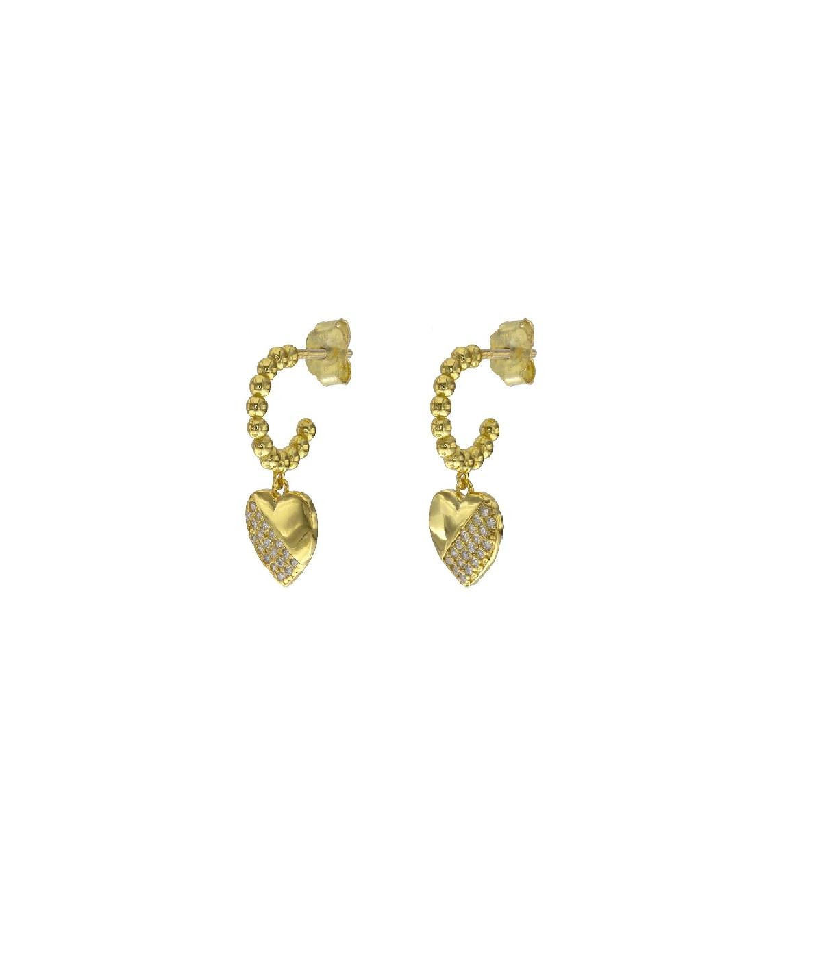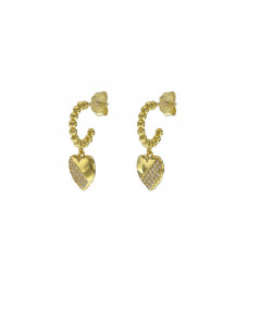 Da un aire romántico a tus dias con estos aros en plata de primera ley bañados en oro con charms en forma de corazón con circonitas.