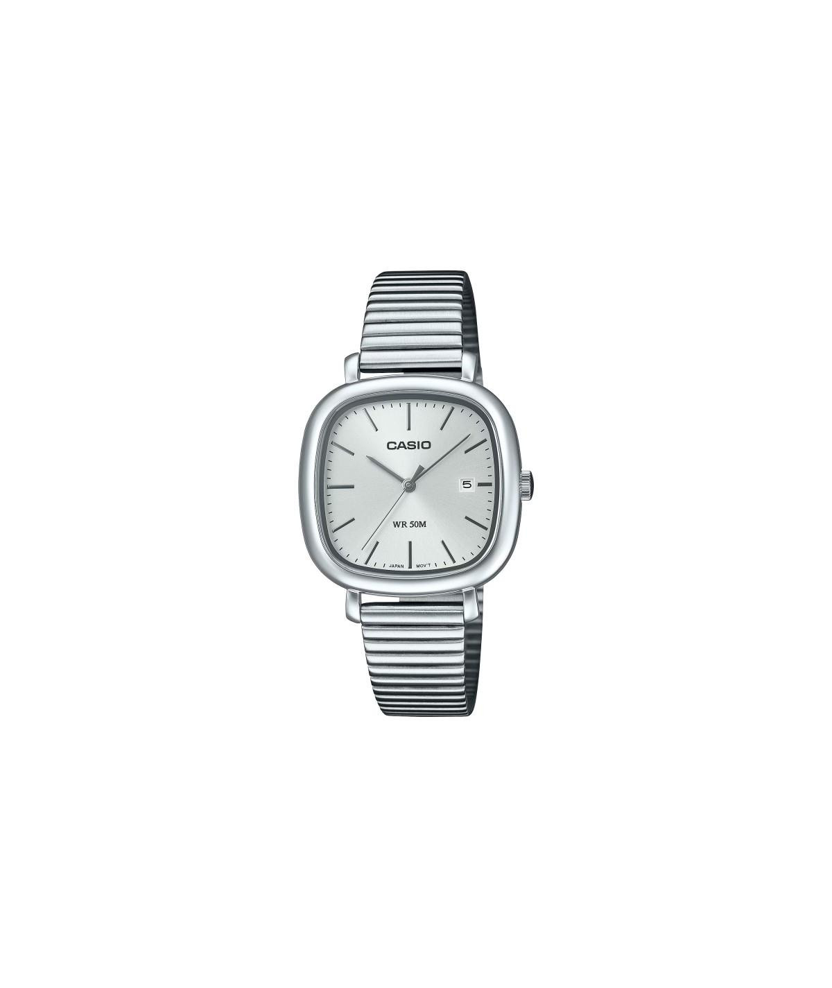 Reloj Casio, para mujer, anaógoco con caja de acero color plata y esfera plateada con calendario
