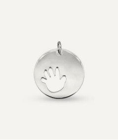 Colgante de plata de ley calado con la silueta de una manita bebé que podrás personalizar grabándolo a tu gusto.