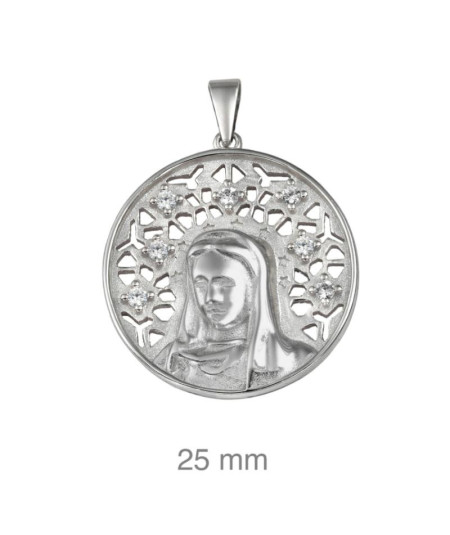 Medalla de Plata de ley, Especial Comunión, calada, con imagen de Virgen María adornada con siete circonitas