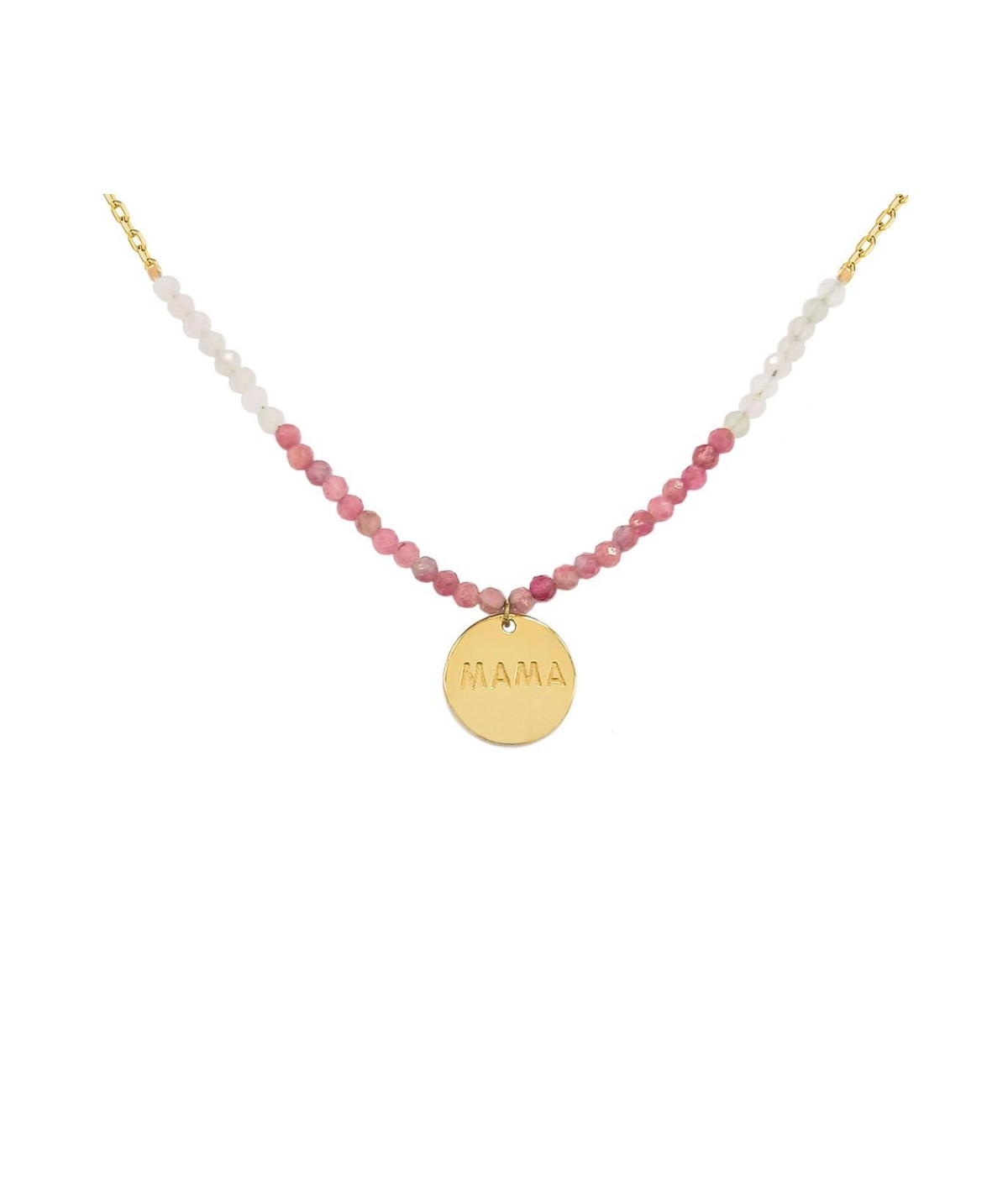 Gargantilla Especial dia de la Madre de plata bañada en oro con chapa "Mamá" y cadena de piedrecitas en tono rosa y blanco