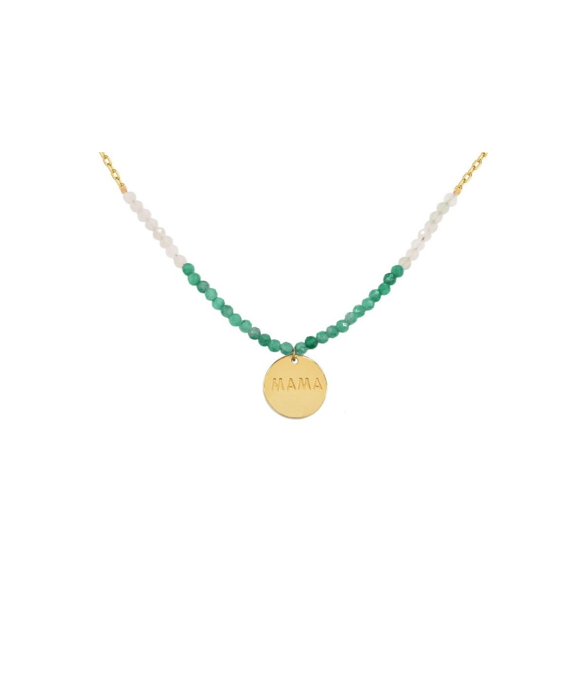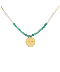 Gargantilla Especial dia de la Madre de plata bañada en oro con chapa con inscripción "Mamá" y cadena de piedrecitas en tono verde y blanco