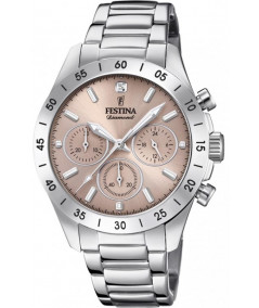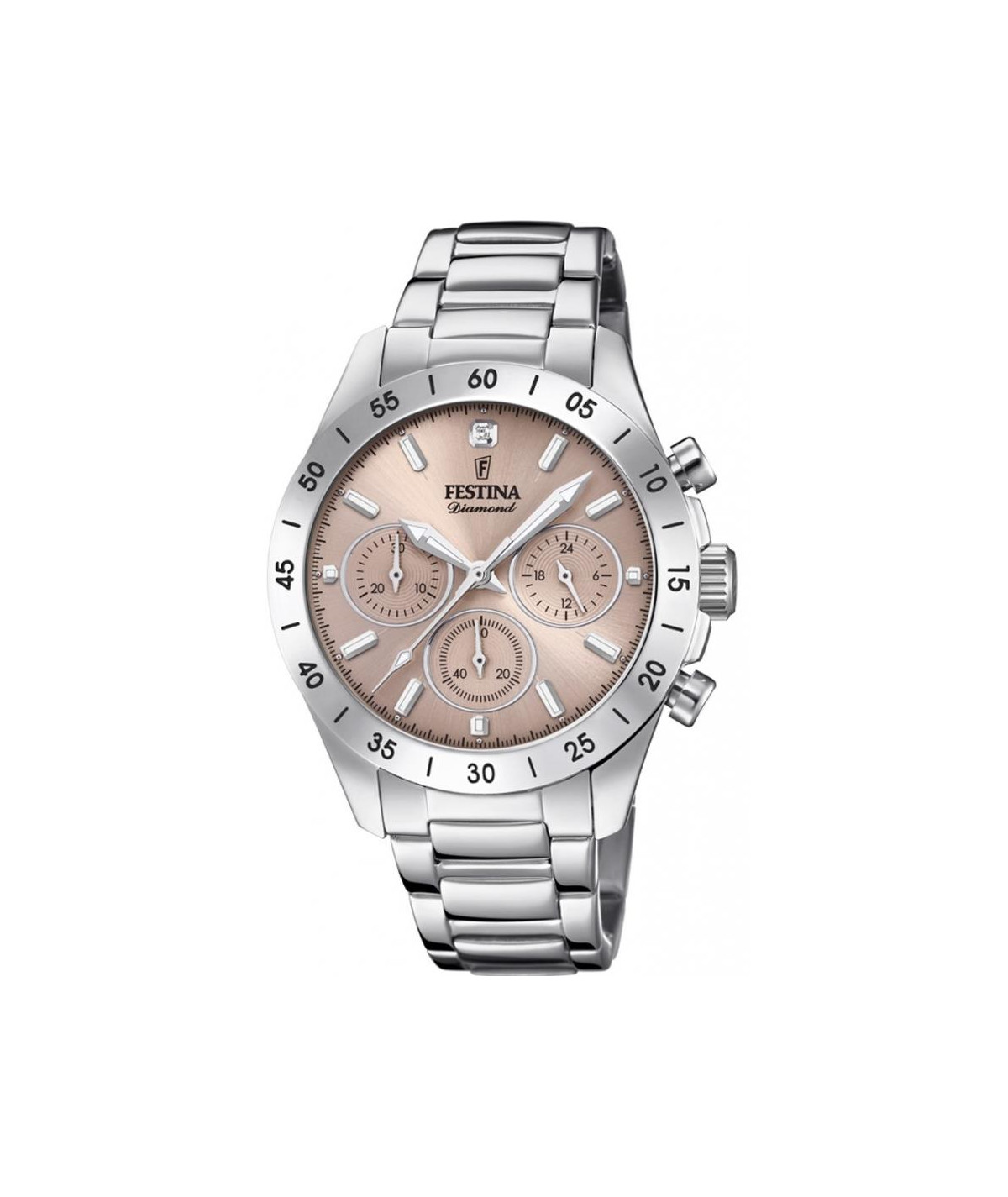 Reloj para mujer, analógico con caja en acero color plata, bisel rotulado y esfera rosé multifunción con crono, con índices plateados y brillante en las doce (1.00mm/0.055 Quil /Grado SI).