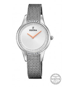 Reloj para mujer, Coleccfión Mademoiselle, analógico con caja en acero color plata y esfera blanca con índices en rosé y pequeños cristales de swarovski.