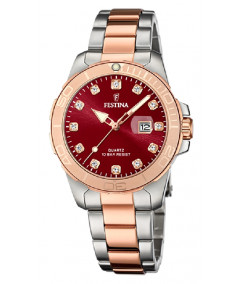 Reloj para mujer, Colección Boyfriend, analógico con caja en acero color plata y esfera tono granate con calendario e índices de circonitas en tono rosé gold a juego con su bisel rotulado giratorio,