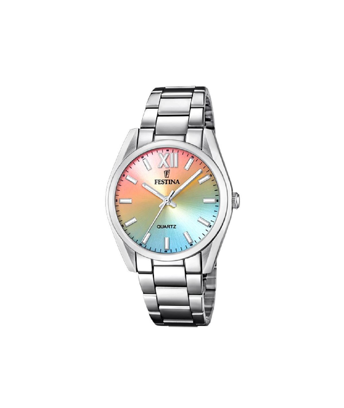 Reloj para mujer, analógico con caja de acero plateado y esfera multicolor con índices color plata
