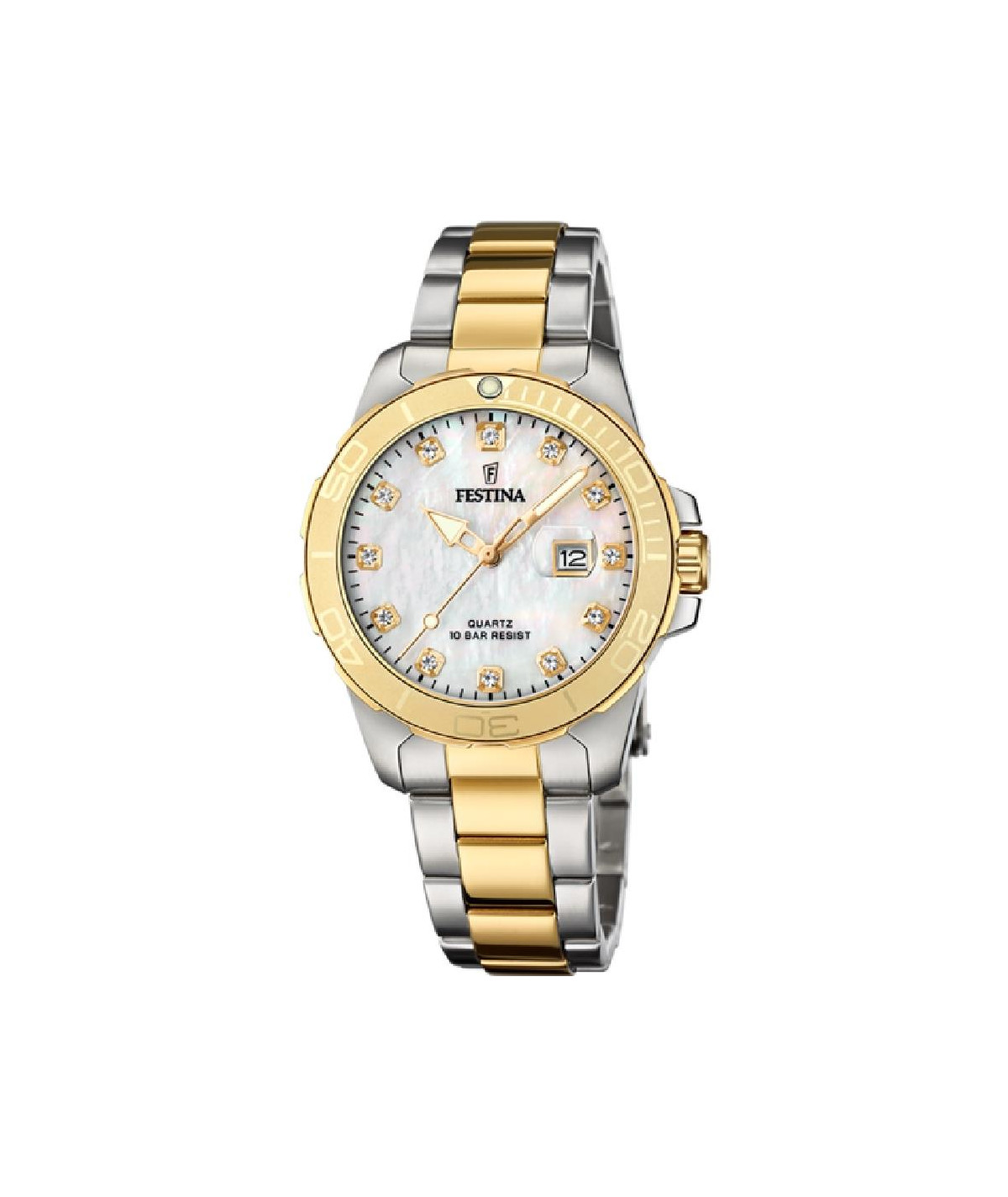 Reloj parra mujer, analógico con caja de acero color plata, bisel dorado y esfera nacarada con calendario e índices de circonitas