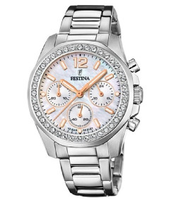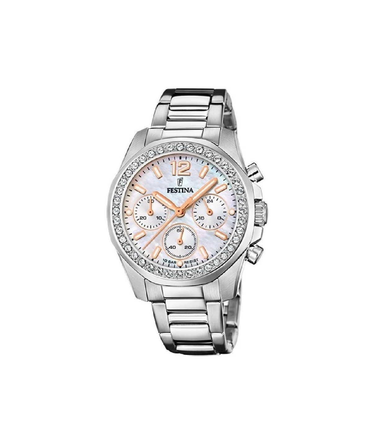 Reloj para mujer, analógico con caja de acero plateado y esfera nacarada con detalles rosé gold, cronógrafo y circonitas en el bisel.