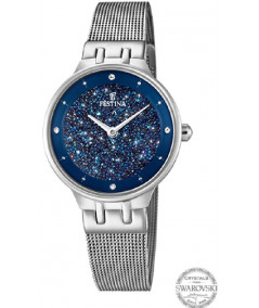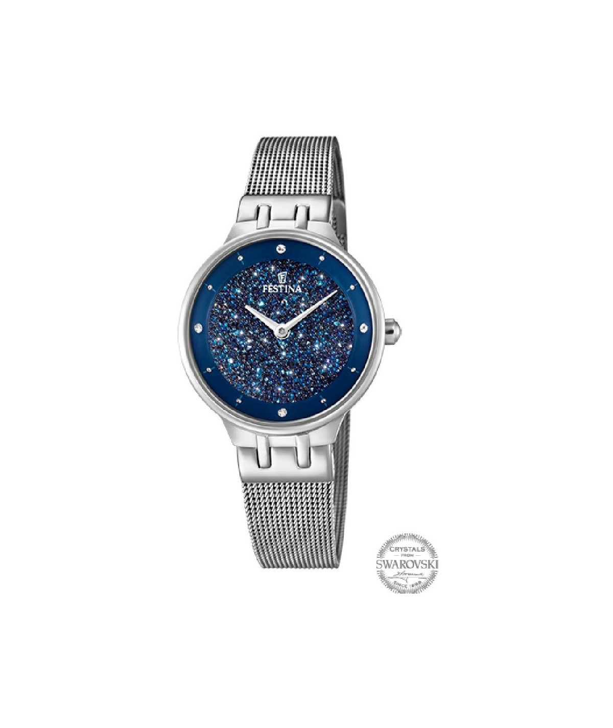 Reloj para mujer, analógico con caja en acero color plata y esfera azul con cristales de swarovski.