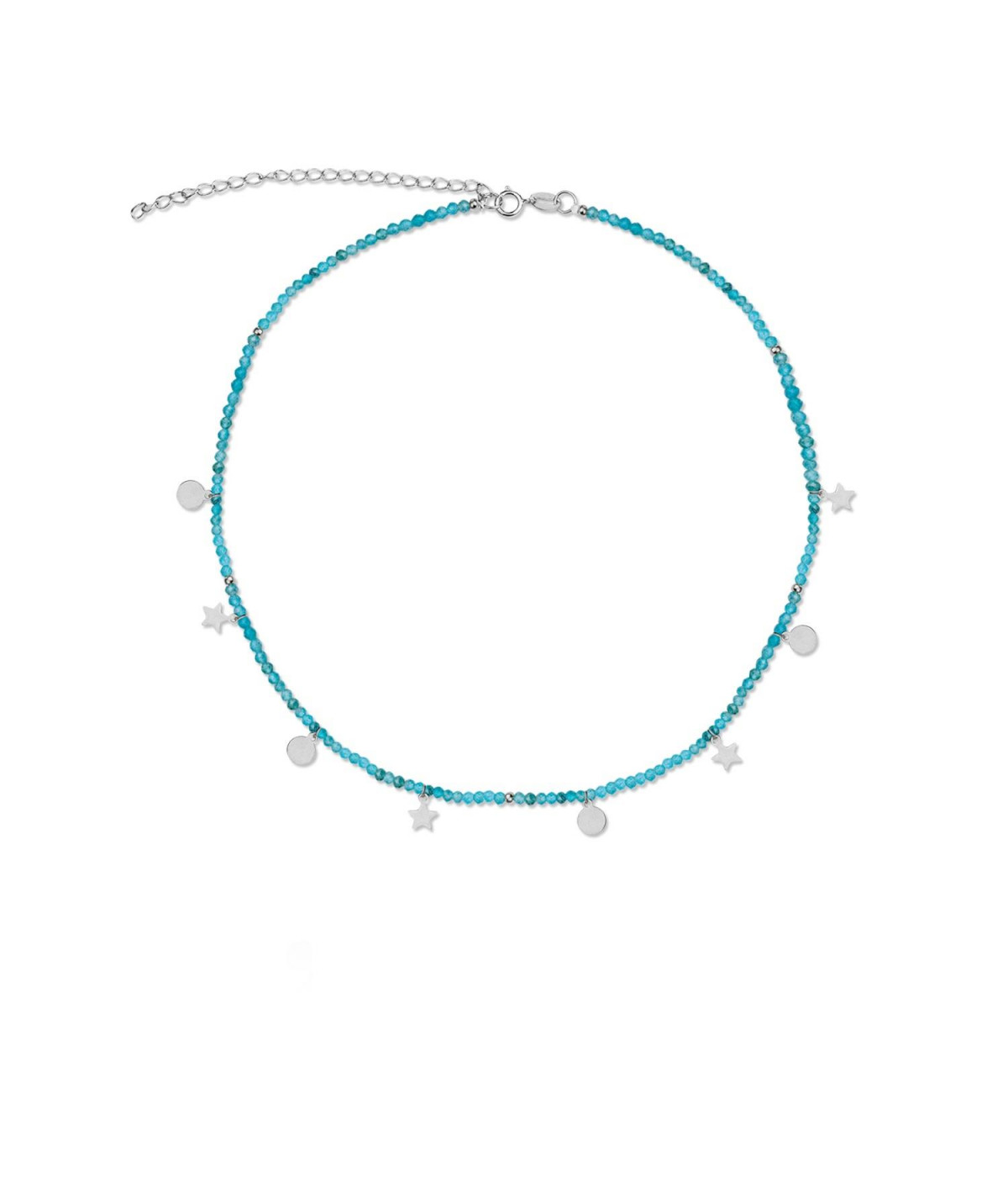Dia un toque de color a tus dias con este collar en tono azul turquesa del que penden pequeñas estrellas y chapas en plata de primera ley