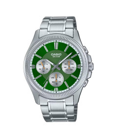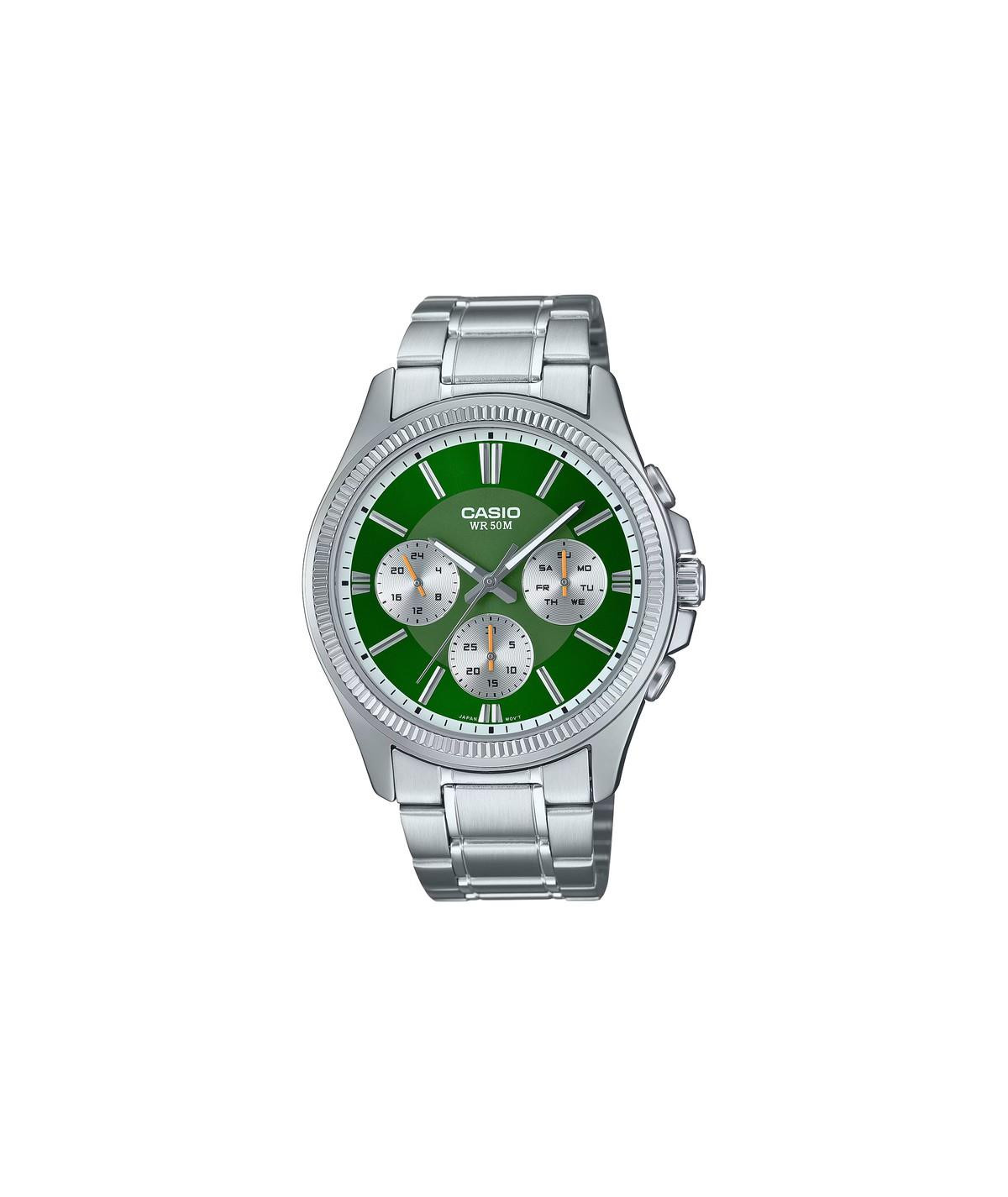 Reloj Casio para hombre, analógico con caja de metal, correa de acero plateado y esfera verde