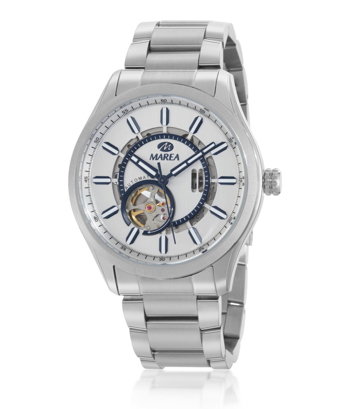 Reloj para hombre, automático con caja de acero color plata y esfera color plata con detalles en azul y movimiento automático visible.