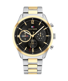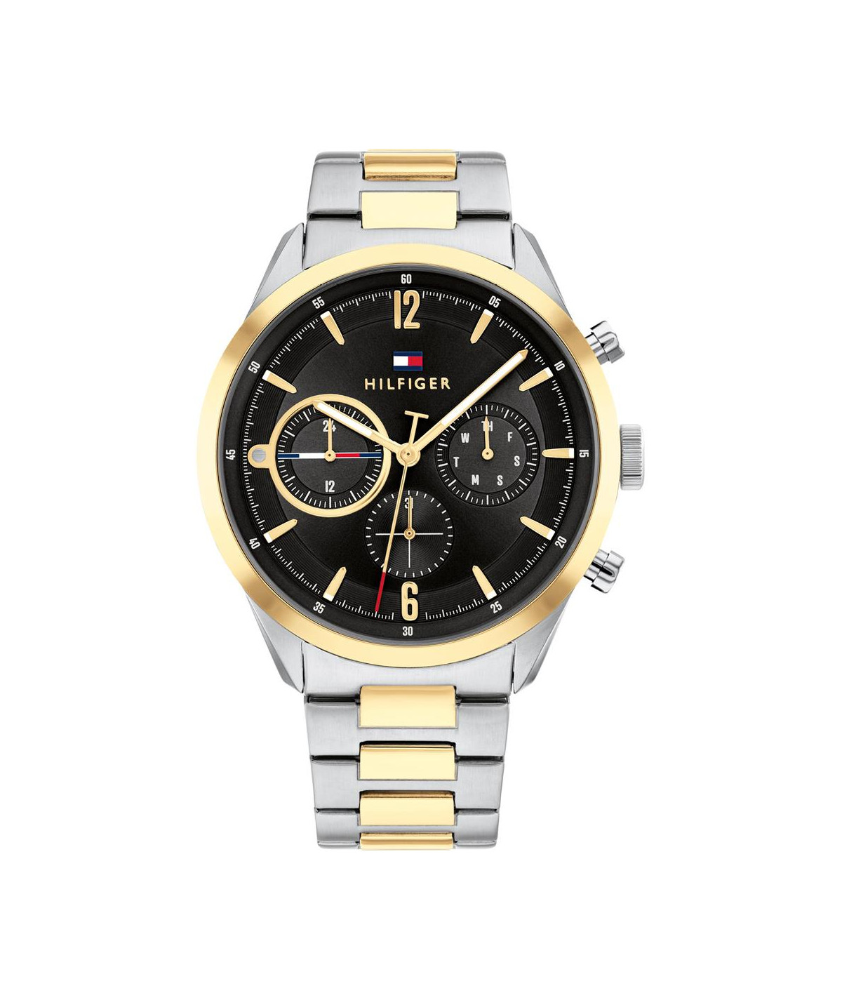Reloj para hombre, analógico con caja de acero color plata y esfera negra multifunción con detalles en dorado a juego con su bisel