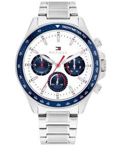 Reloj para hombre, analógico con caja de acero color plata y esfera blanca multifunción con bisel rotulado en tono azul