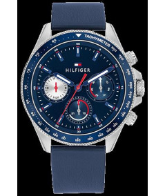 Reloj para hombre, analógico con caja de acero color plata y esfera azul oscuro, multifunción con bisel rotulado en tono azul