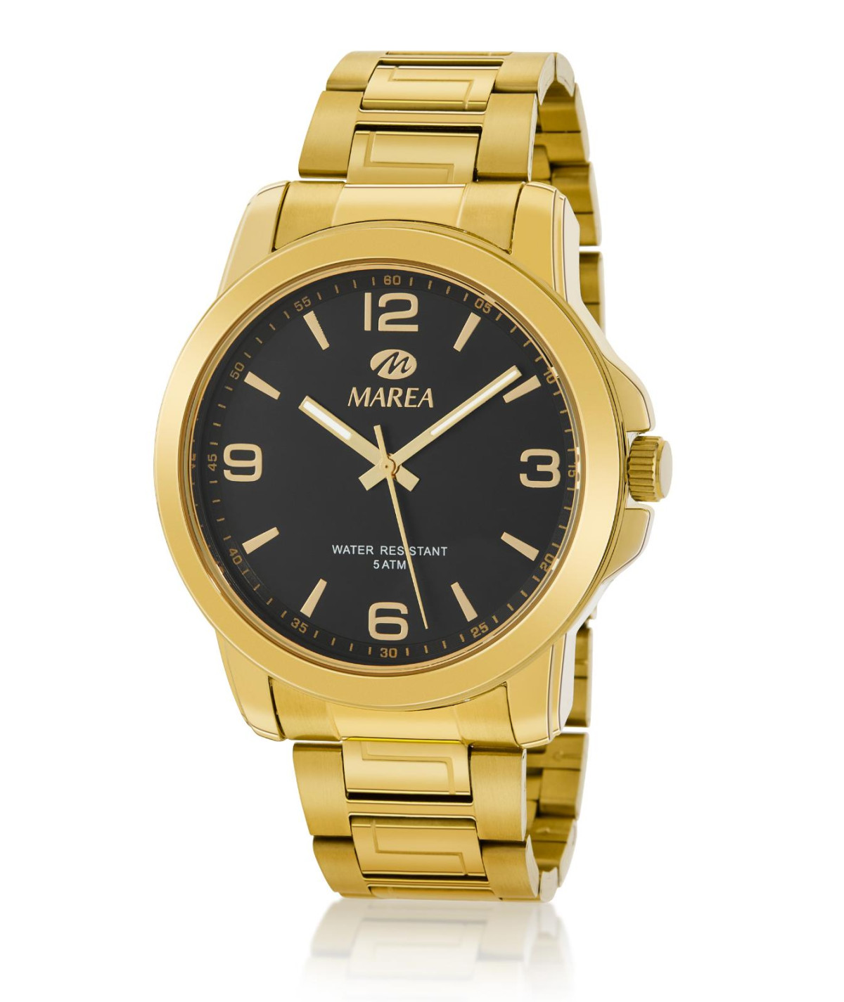 Reloj para hombre, analógico con caja de metal antialérgico y esfera negra con números e índices color dorado
