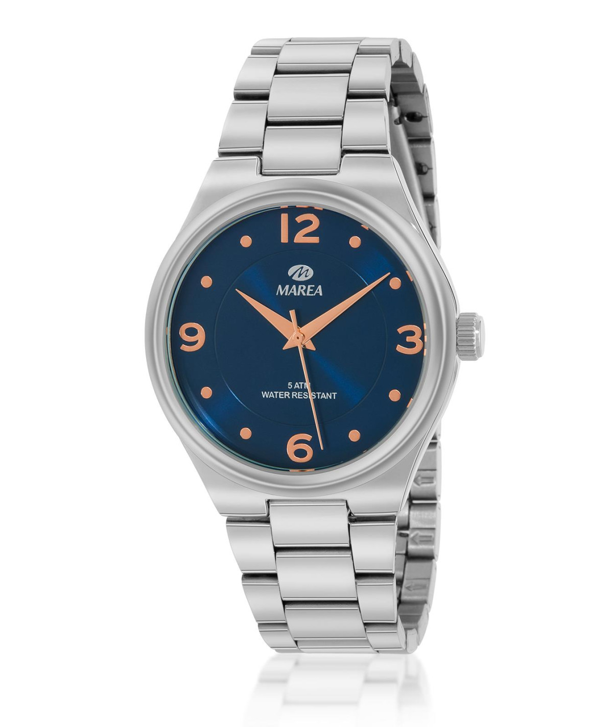 Reloj para hombre, analógico con caja de metal antialérgico color plata y esfera azul con números e índices color rosé gold