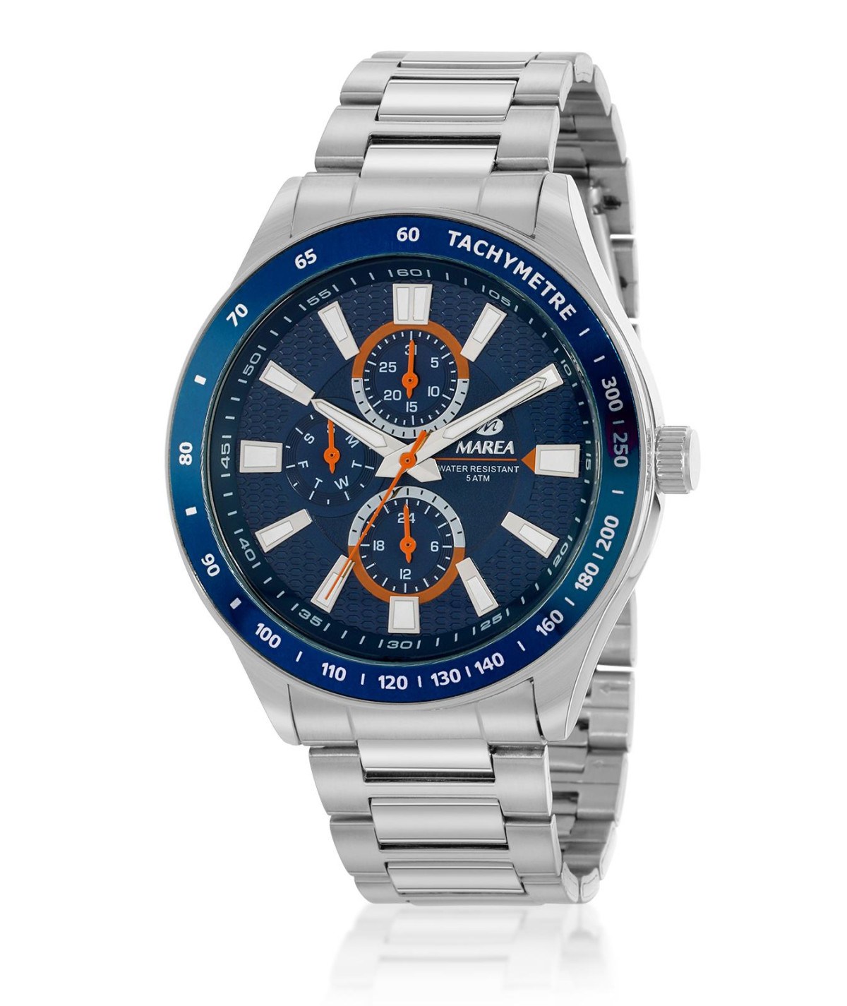 Reloj para hombre, analógico con caja de metal antialérgico color plata y esfera azul multifunción