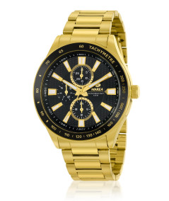 Reloj para hombre, analógico con caja de metal antialérgico color dorado y esfera negra multifnción a juego con su bisel