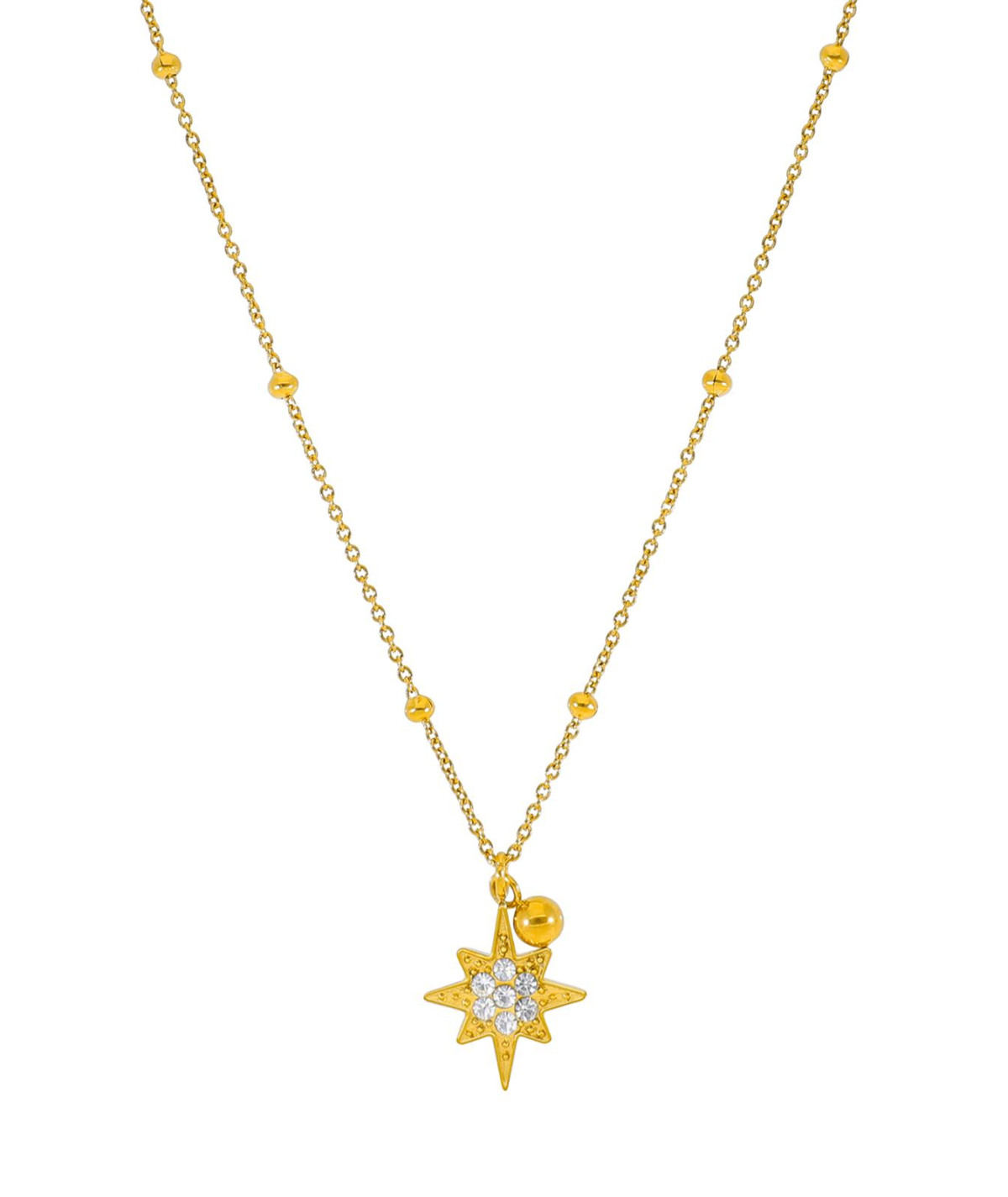 Collar para mujer de acero color dorado, está compuesto por cadena con bolitas alternas y un colgante de estrella polar con circonitas y bola de acero lisa