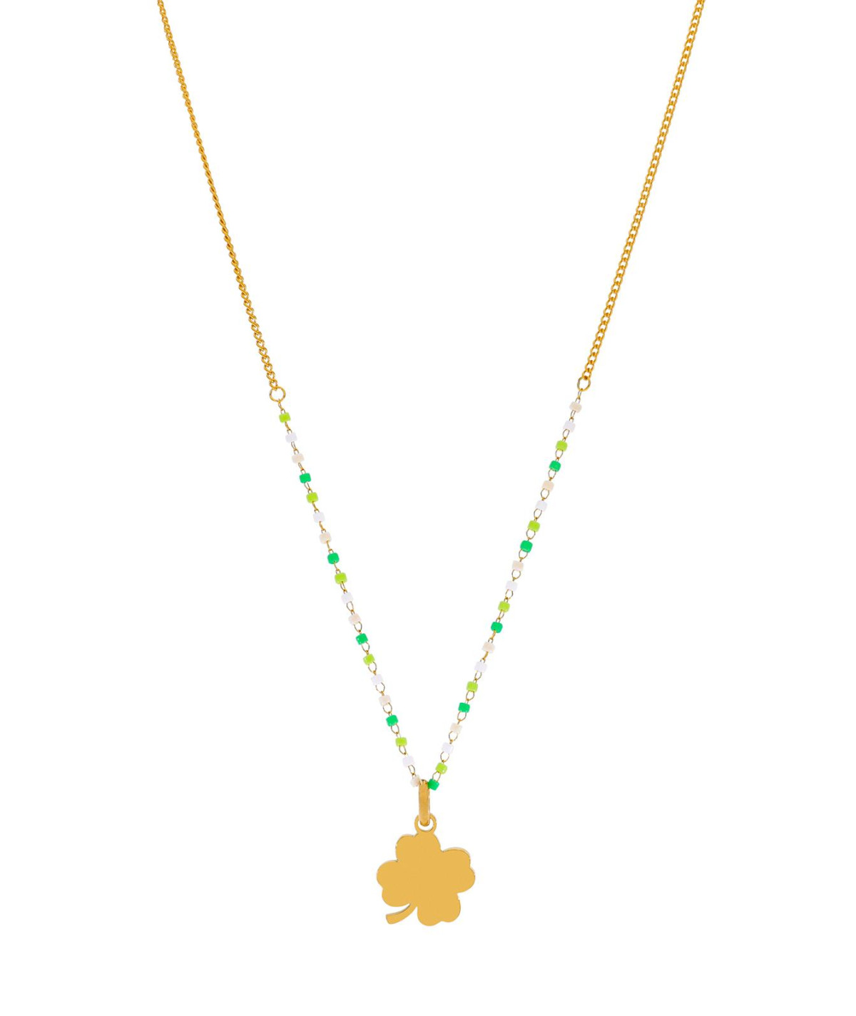 Un colllar para mujer, de acero color dorado con detalles en tonos verdes, rosa palo y colgante de trébol