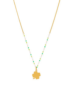 Colllar para mujer, de acero color dorado con detalles en tonos verdes, rosa palo y colgante de trébol