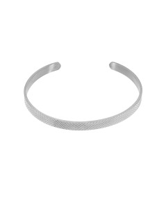 Un pulsera para mujer, de acero color plata, abierta y rígida con detalles en relieve en forma de rombo