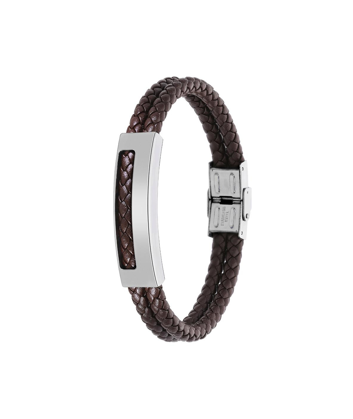 Una pulsera para hombre, combinada en piel y acero, con doble pulsera trenzada color marrón y placa central de acero color plata al igual que su cierre que podrás ajustar fácilmente a la medida deseada