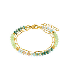 Pulsera para mujer, de acero color dorado con doble cadena eslabones y piedras semipreciosas. Piedra: punto verde Jasper y amazonita