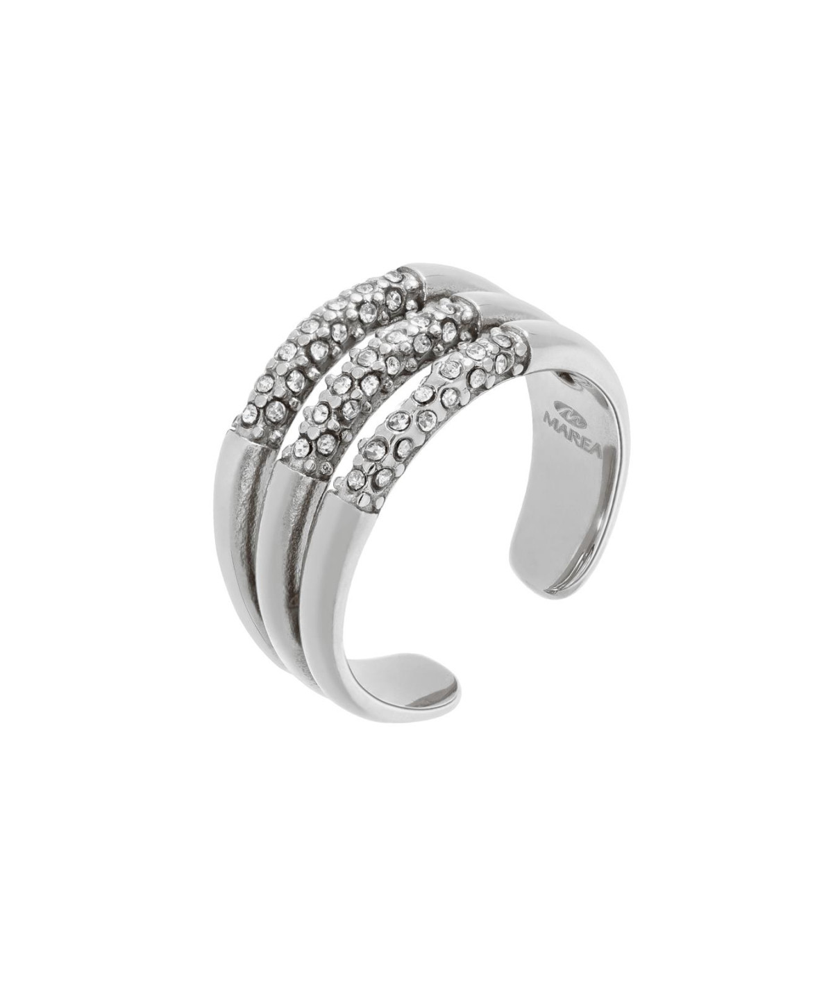 Anillo para mujer de acero plateado, abierto con circonitas, un modelo llamativo y elegante fácil de combinar con cualquier look
