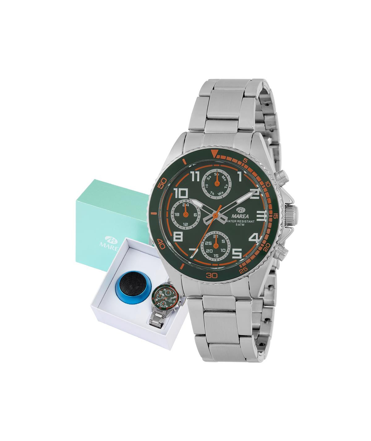 Reloj para niño, analógico con caja de metal antialérgico color plata y esfera verde oscuro con detalles en naranja, multifuncción con cronógrafo