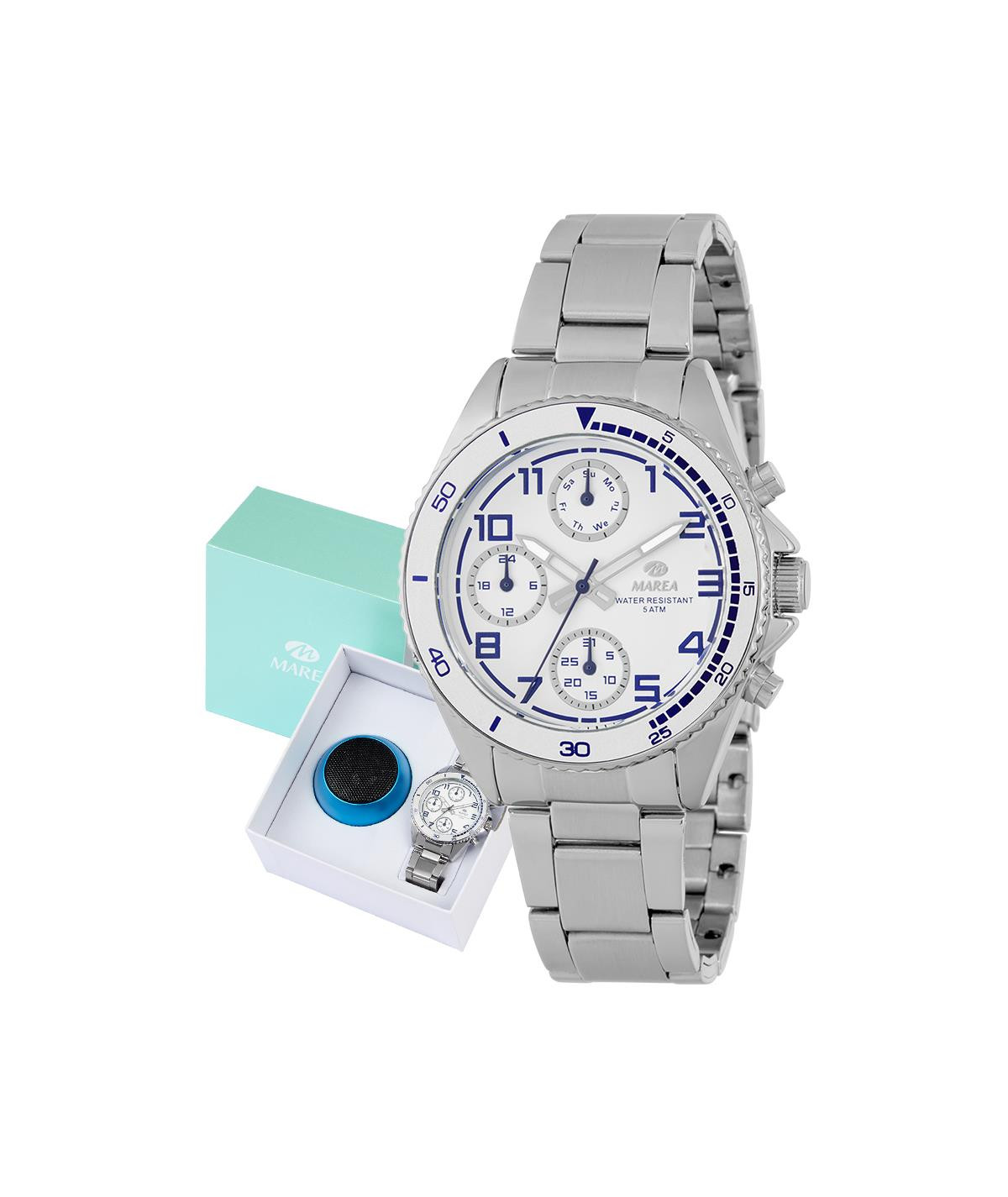 Reloj para niño, analógico con caja de metal antialérgico color plata y esfera blanca con detalles en azul, multifuncción con cronógrafo