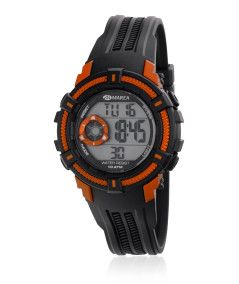 Reloj infantil, digital con caja de resina color negro con detalles en naranja