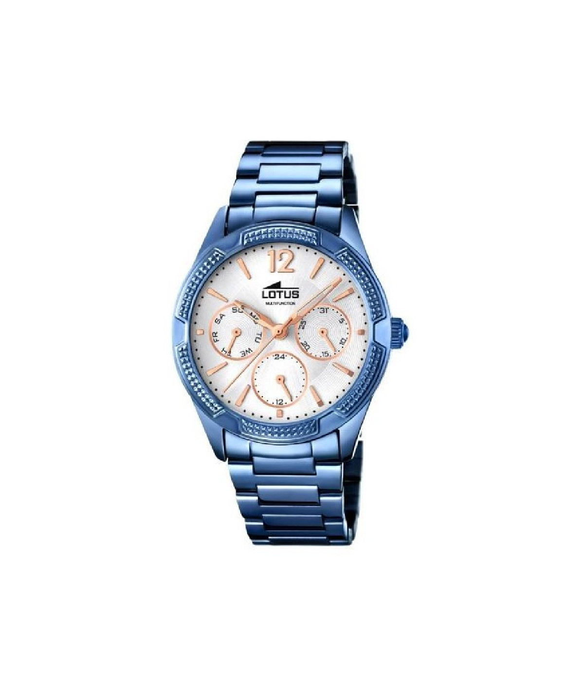 Reloj para mujer, Colección Trendy, analógico con caja y correa en acero pulido con tratamiento ip azul y esfera blanca, multifunción con calendario y dia de la semana, con detalles en rosé. Diámetro de la caja 38mm. Sumergible a 5 ATM. 2 años de garantí