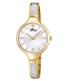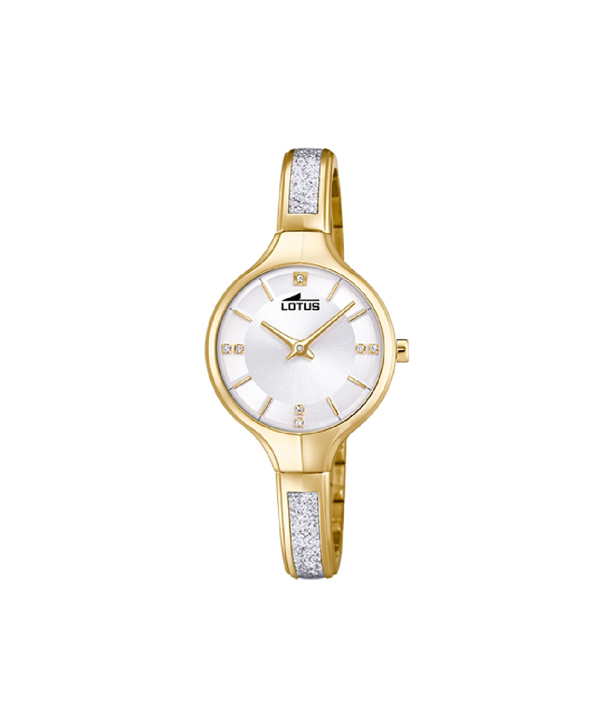 Reloj para mujer, analógico con caja en acero chapado color dorado y esfera plateada con índices de circonitas.