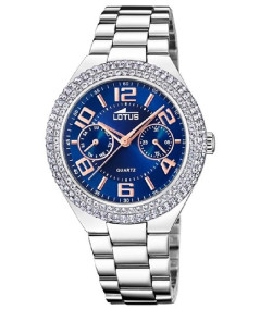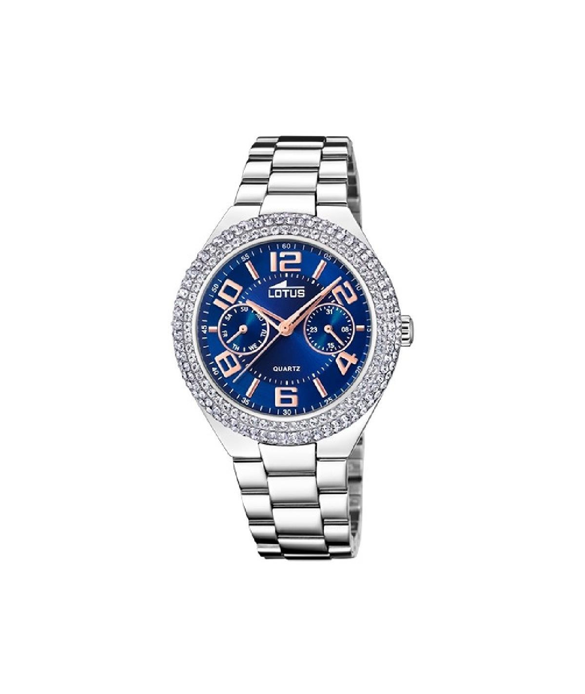 Reloj para mujer, analógico con caja de acero color plata, bisel de circonitas y esfera multifunción con calendario y dia de la semana en azul con detalles rosé gold