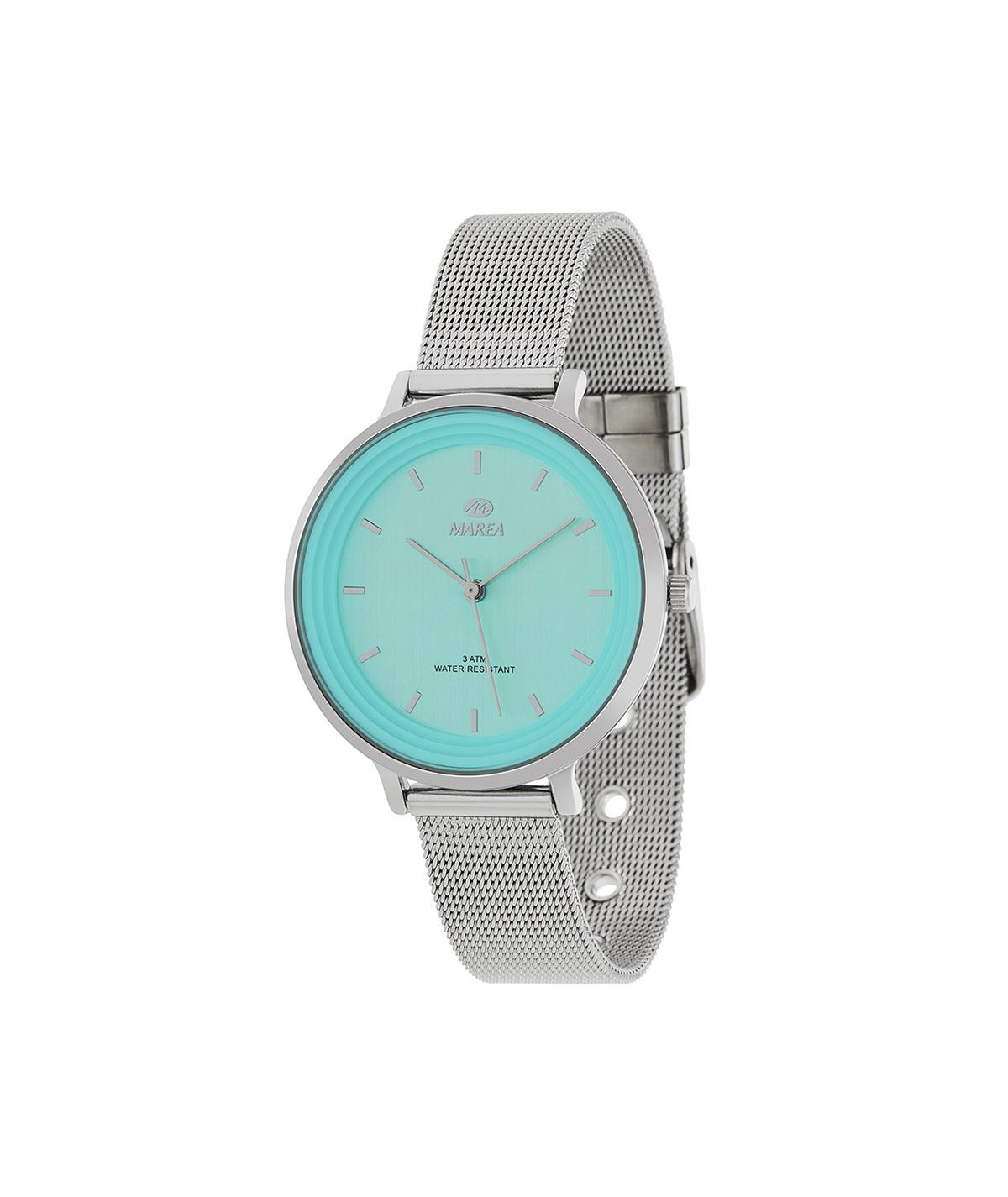 Reloj para mujer, analógico con caja en metal antialérgico color plata y esfera turquesa con índices plateados. La correa es de acero tipo malla milanesa ajustable fácilmente a la medida deseada.