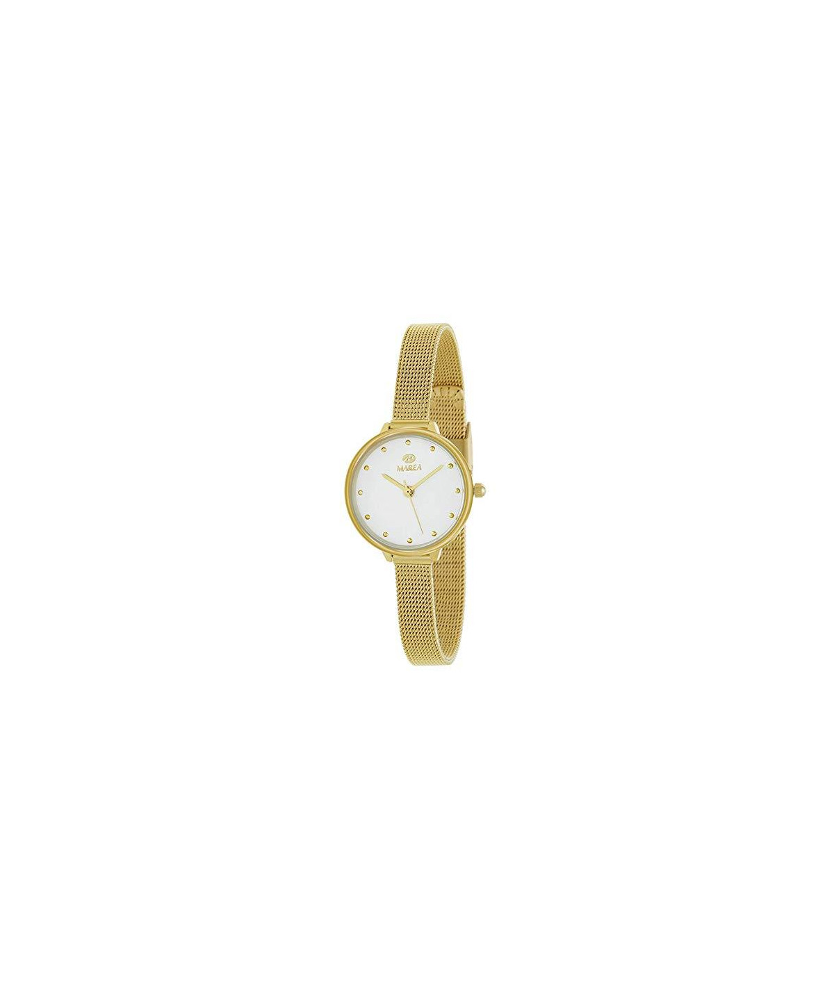 Reloj para mujer, analógico con caja en metal antialérgico color dorado y esfera blanca con índices dorados. Correa en acero tipo malla milanesa ajustable fácilmente a la medida deseada.