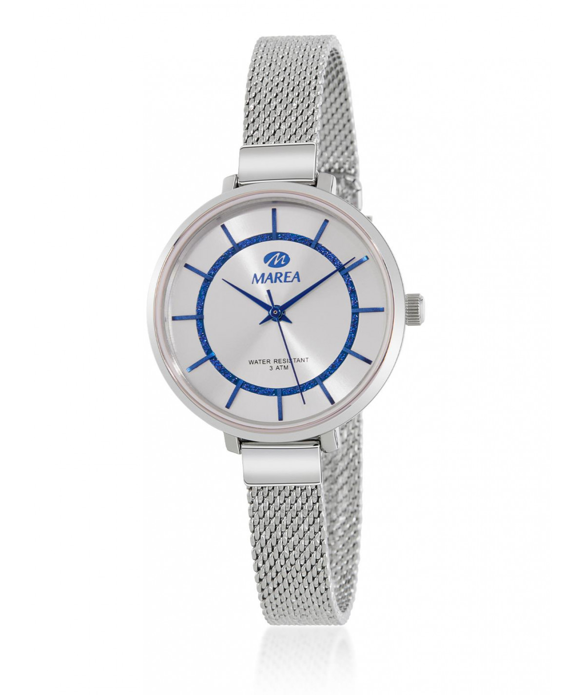 Reloj para mujer, analógico con caja en metal antialérgico color plata y esfera plateada con índices y detalles en azul