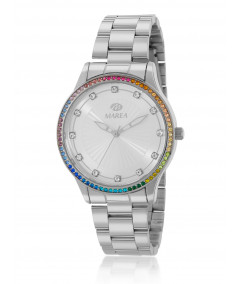 Reloj para mujer, analógico con caja en metal color plata y esfera blanca con bisel de circonitas de colores.