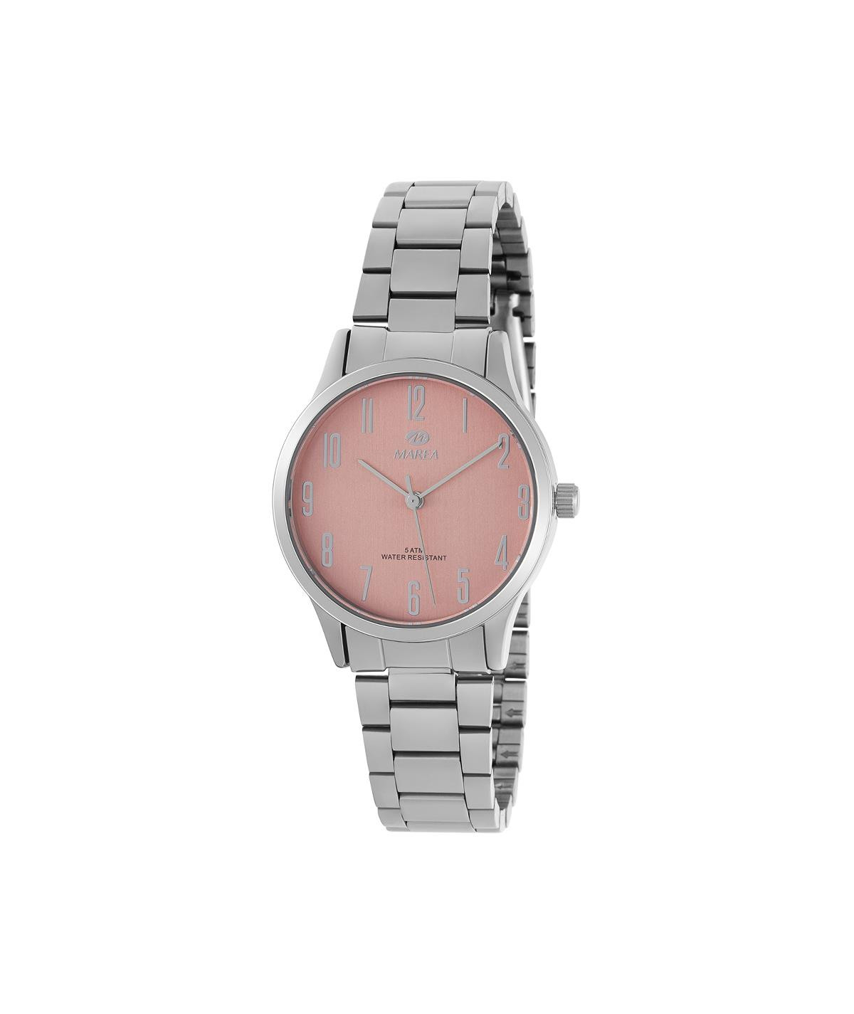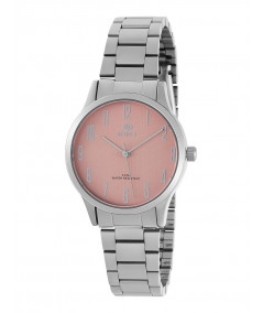 Reloj para mujer, analógico con caja en metal antialérgico plateado y esfera rosa con números plateados.