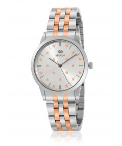 Reloj para mujer, analógico con caja en metal antialérgico color plata y esfera plateada con detalle de estrellitas en tono rosegold