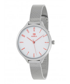 Reloj para mujer, analógico con caja en metal antialérgico color plata y esfera blanca con números e índices con color coral.