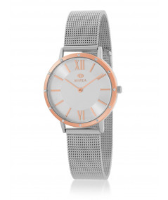 Reloj para mujer, analógico con caja en metal antialérgico, bisel rosé gold con circonitas y esfera plateada con detalles a juego con su bisel.