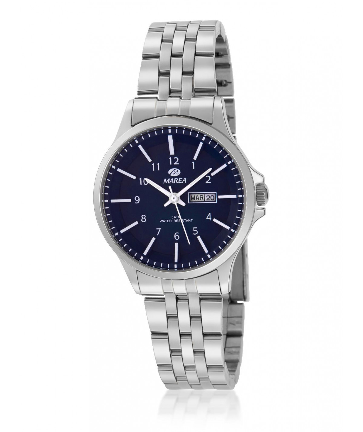 Reloj para mujer, analógico con caja en acero color plata y esfera azul oscuro con calendario e índices en rosé a juego con su bisel.