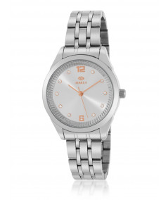 Reloj para mujer, analógico con caja en metal antialérgico color plata y esfera plateada con índices indices de pedrería y agujas en color rosegold.