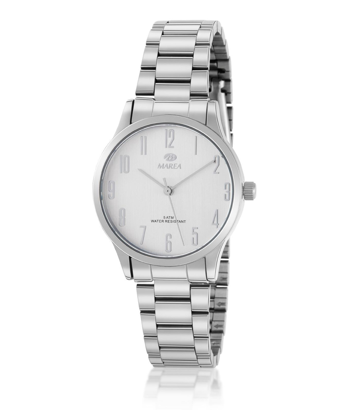 Reloj para mujer, analógico con caja en metal antialérgico plateado y esfera blanca con números plateados.