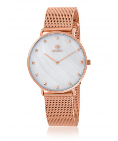 Reloj para mujer, analógico con caja en metal antialérgico color roségold y esfera blanca nacarada con índices en color roségold